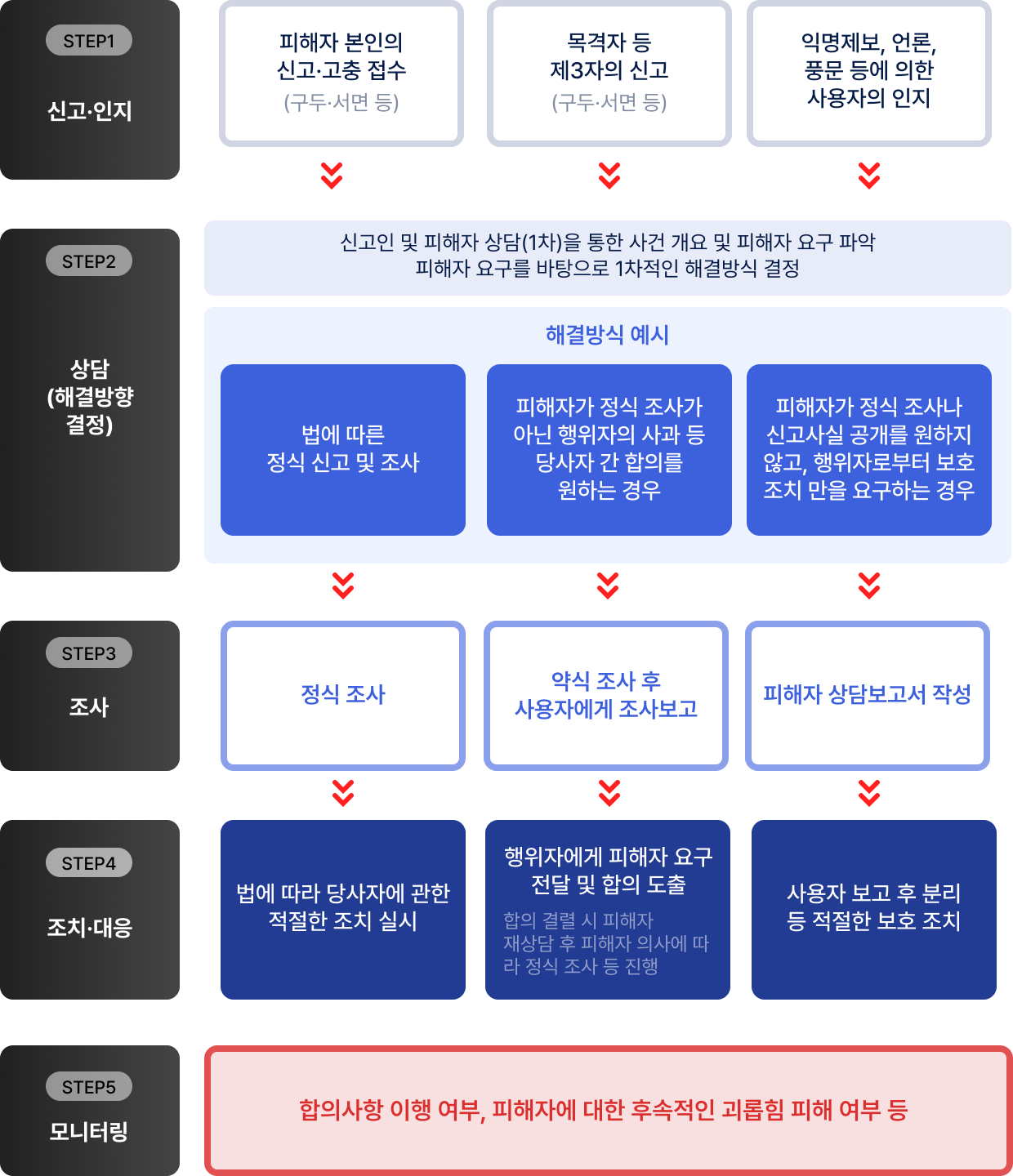상담 진행시 신고인 및 피해자 상담을 통해 사건개요 및 피해자 요구 파악 후 이를 바탕으로 1차적인 해결방식을 결정